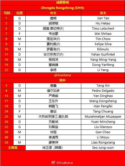 成齐蓉城替补:32-刘殿座、3-唐鑫、17-王东升、18-韩鹏飞、26-元敏诚、4-德尔增多、15-严鼎皓、25-木热合买提江·莫扎帕、39-甘超、58-廖荣祥、24-唐创、48-李漠雨