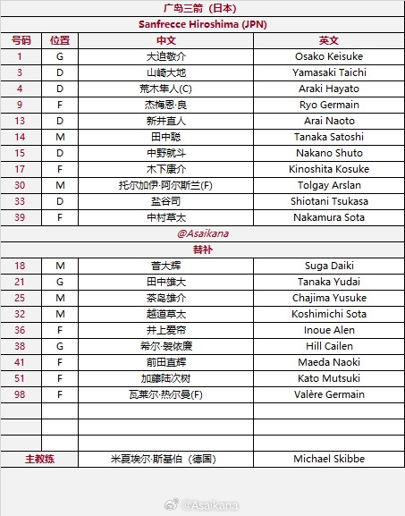 广岛三箭首发:1-大迫敬介、2-山崎地面、4-荒木隼东谈主、13-新井直东谈主、15-中野就斗、33-盐谷司、14-田中聪、30-托尔加伊·阿尔斯兰、9-杰梅恩·良、17-木下康介、39-中村草太