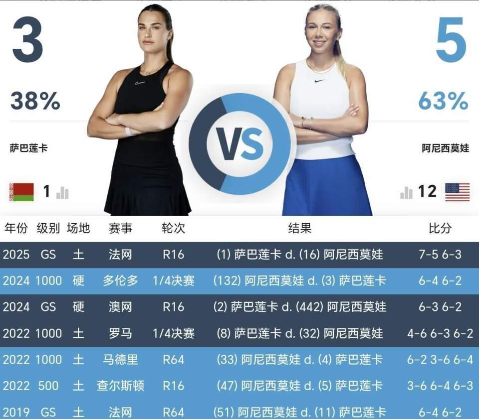 萨巴伦卡是女网名次寰宇第一,但本年的大满贯赛事上却有些无语,澳网决赛输给好意思国选手凯斯,法网决赛输给好意思国选手高芙,温网半决赛输给了好意思国选手阿尼西莫娃,她照旧最擅长打中国选手郑钦文。本赛季四大满贯女单决赛,齐有好意思国选手的身影。现时好意思网决赛再次对阵好意思国选手阿尼西莫娃,萨巴伦卡能否拿到一个冠军呢?