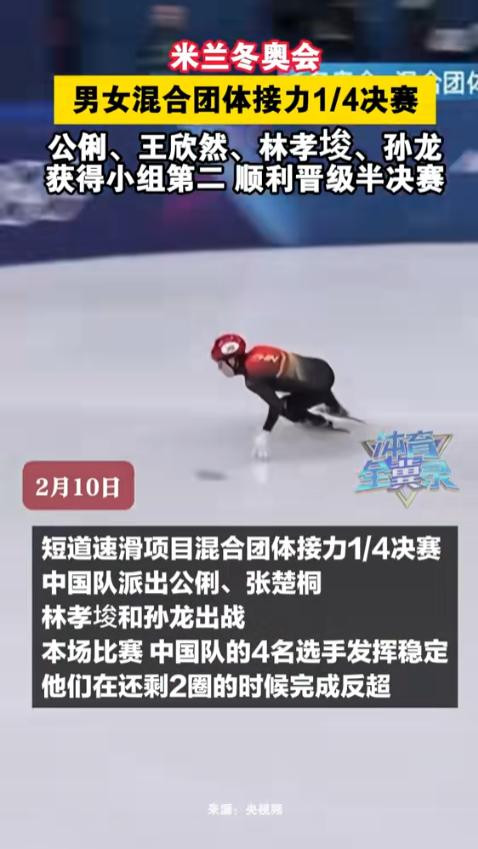 我们的晋级之路太顺了,1/4决赛,公俐、张楚桐、林孝埈、孙龙组队,没拿小组第一,但2分39秒20的收获,稳稳晋级半决赛。