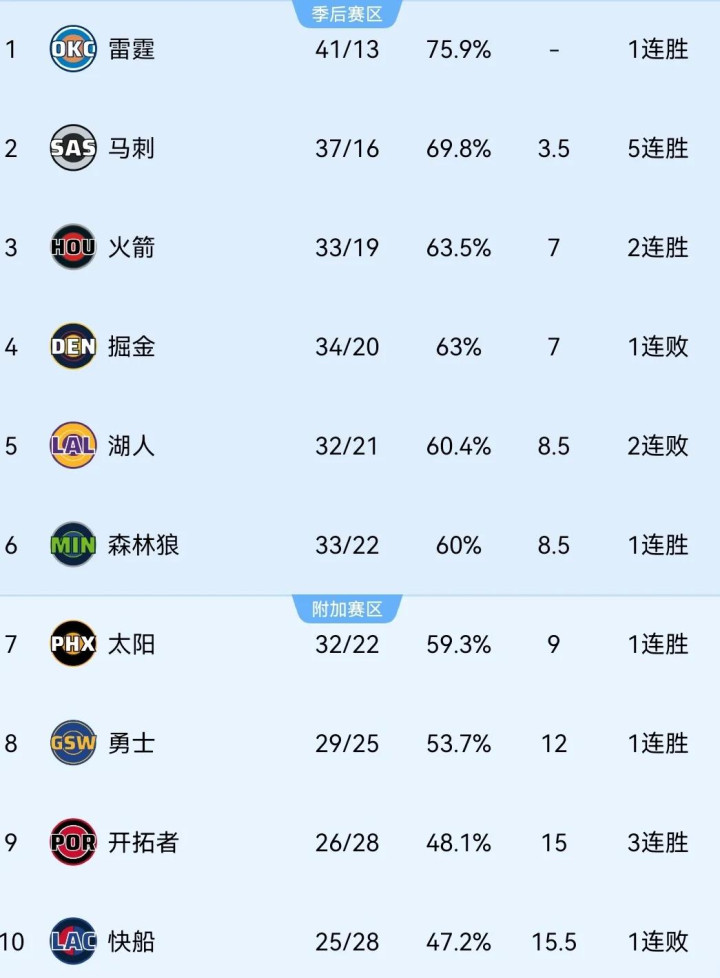 本赛季于今,马刺以37胜16负连续高居西部第二,过时第一的雷霆3.5个胜场,逾越第三的火箭3.5个胜场;湖东说念主以32胜21负排名西部第五,仅逾越第七的太阳0.5个胜场,随时有可能掉出季后赛区域。